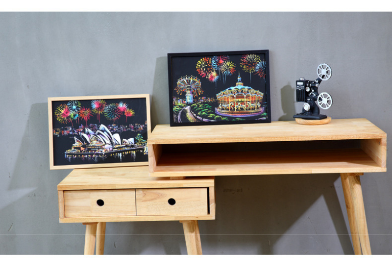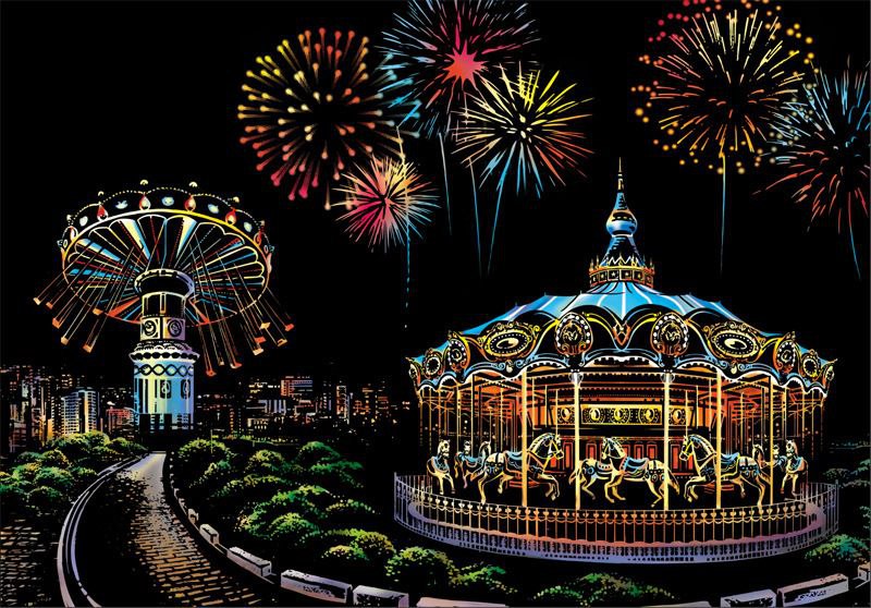 Amusement Park Scratch Art – əyləncə parkının rəngarəng və enerjili gecə atmosferini əks etdirən unikal scratch art məhsuludur. Bu dizaynda karusel, attraksionlar və atəşfəşanlıq səhnəsi qara səthin altında gizlənir və qaşıdıqca parlaq, neon rənglərlə canlanaraq möhtəşəm görüntü yaradır.